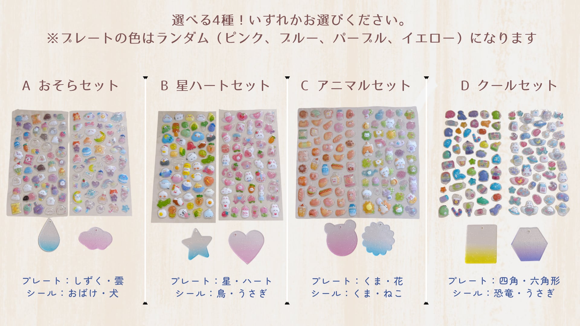 ※プレートの色(ピンク、ブルー、パープル、イエロー)はランダムになります。 ※シールの絵柄の組み合わせは写真と若干異なる場合がございます。ご了承ください。