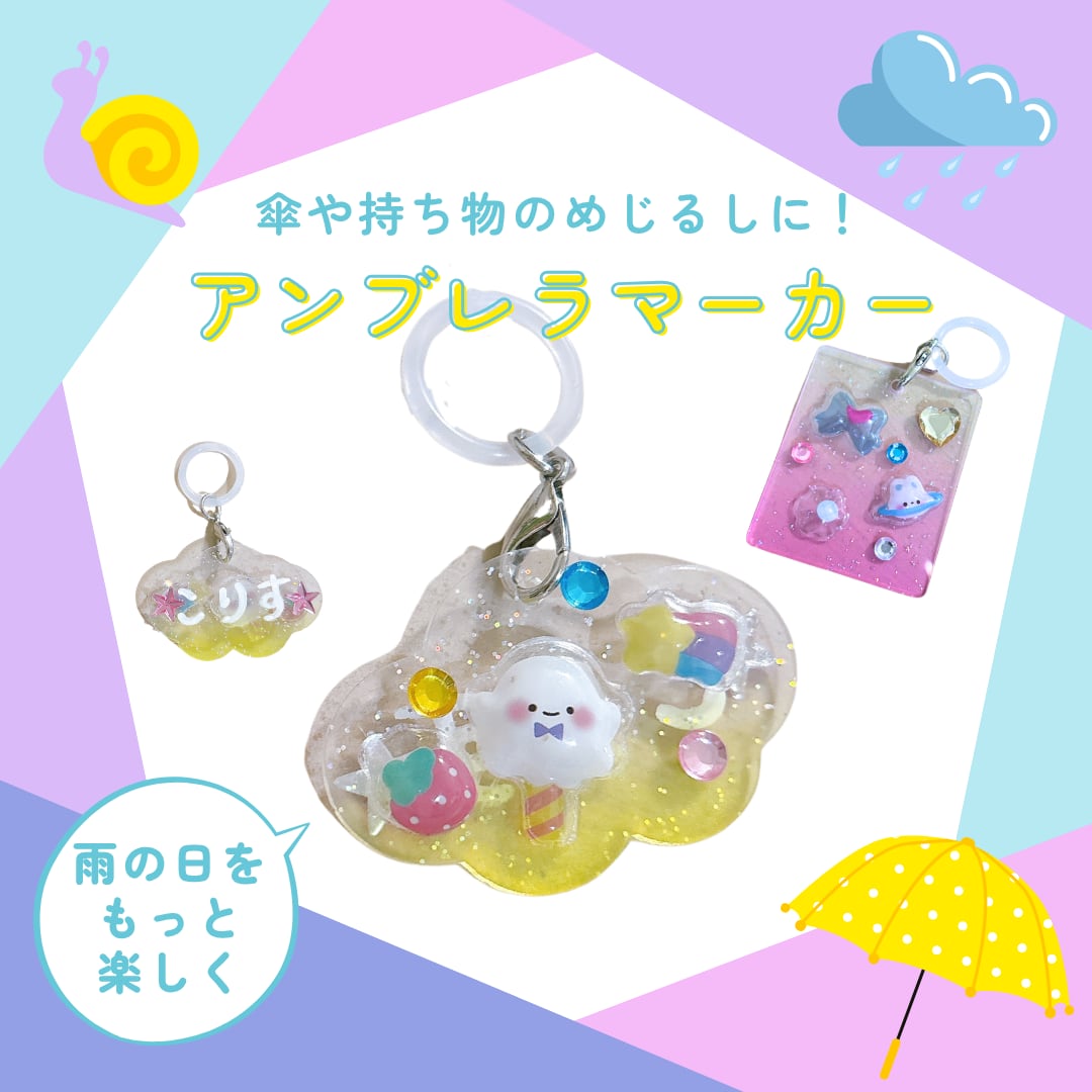 透明感あふれるグラデーションプレートに、ぷっくり可愛い3Dシールでデコレーション!自分だけの特別なアンブレラマーカー(チャーム)が作れるキットです。シールを貼るだけで完成するので、小さなお子様でも簡単におつくりいただけます。